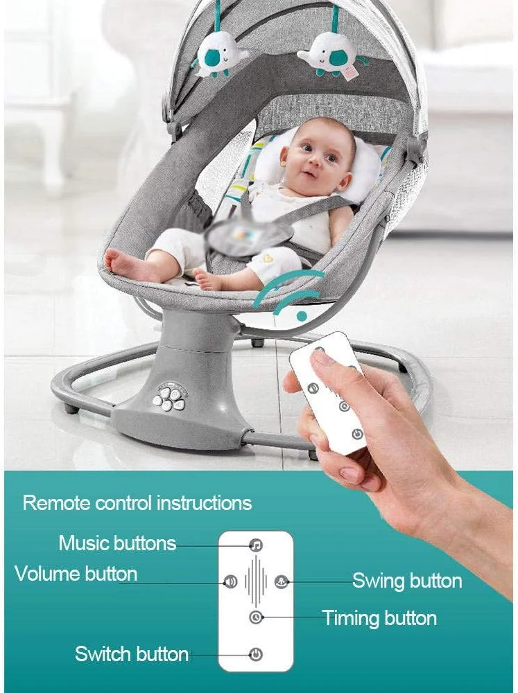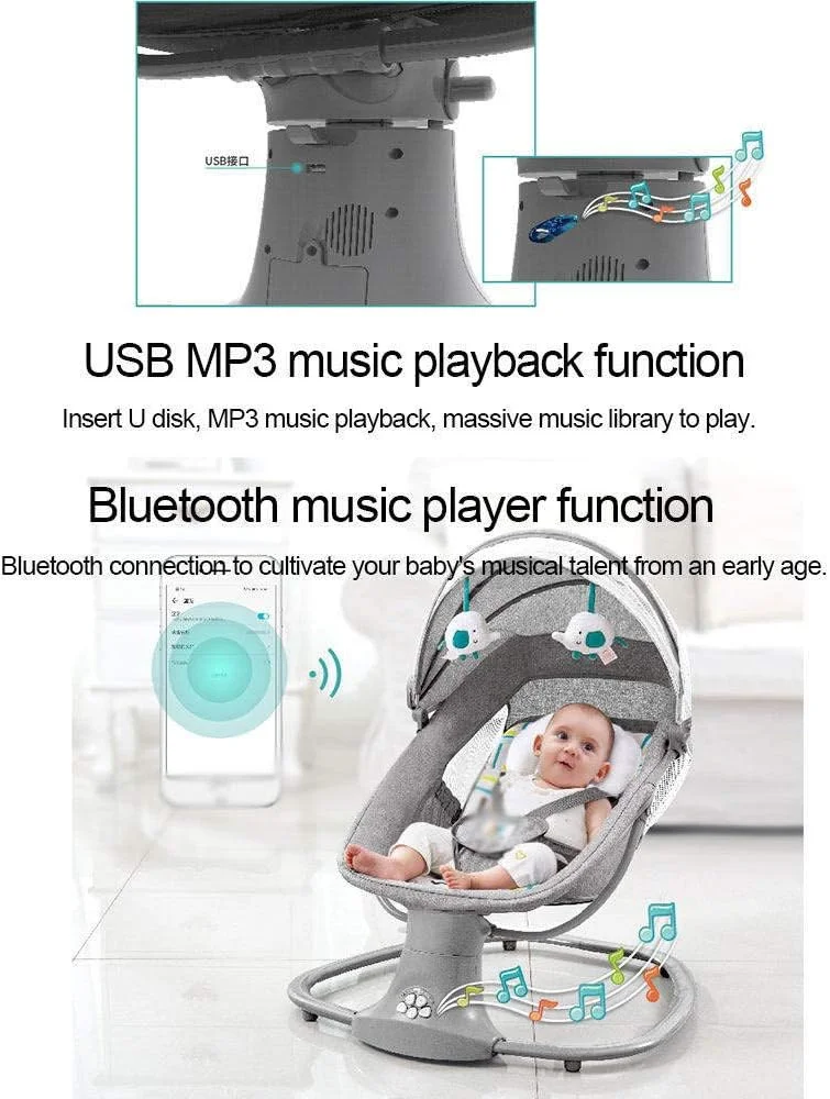 এই ৩-ইন-১ মাল্টিফাংশনাল বেবি সুইং এবং বেসিনেট রকিং চেয়ার, এটি বাম এবং ডানে দোল খায়, সুন্দর সঙ্গীত বাজায়, এতে ব্লুটুথ বৈশিষ্ট্য, রিমোট কন্ট্রোল এবং মশারি রয়েছে। এটিকে বিছানা এবং রকিং চেয়ারেও রূপান্তর করা যেতে পারে